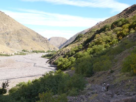 Am Morgen soll es um 9 Uhr los gehen: Finde ich viel zu spät. Also wird mein Führer herbei telefoniert und wir starten um 8:10 Uhr, das Maultier mit dem Gepäck kommt später nach, es ist ja viel schneller. Zunächst geht es über den Berg nach Arumd, wer dort wohnt hat 40 Minuten gespart. Hinter Arumd geht es bis zum Ende des steiniges Flusstales, dort steigt der noch steinigere Fußpfad an ...