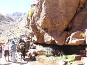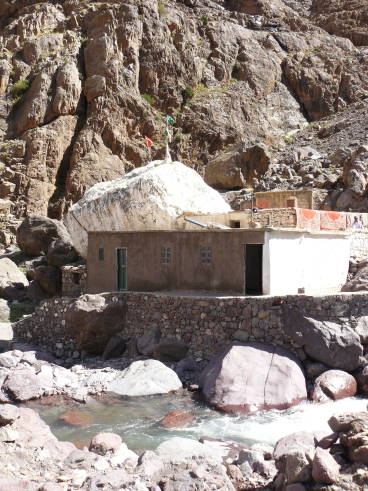Wir sind am Marabut Chamharouch auf 2.300 m: Auf der ganzen Strecke sind keine Dörfer, aber hier am Marabut sind Verkaufsstände für Souvenirs, Essen und Getränke. Und wer von bösen Geistern besessen ist, bekommt Hilfe vom Marabut. War auch bis hierher der steinige Anstieg nicht ohne (für mich Großmutter), so spüre ich nun doch die Höhe, mein Herz klopft wie wild. Aber Lahcen, der erfahrene Führer passt genau auf, dass ich mich nicht überanstrenge ...