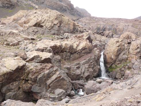 Wir passieren die "Kaskaden", viele kleine Bergbäche, die den steilen Hang herunter brausen. Überhaupt verläuft die ganze Strecke entlang eines tosenden Wasserlaufs, von Stille ist hier nichts zu spüren. Tief unten weitet sich das Tal zu einer relativ ebenen Fläche, hier ist Halbzeit, hier machen die Gruppen Mittagspause. Der Clou ist eine Zweipersonengruppe der Kasbah Toubkal, für die unter dem Tisch mit zwei Stühlen sogar ein roter Teppich ausgelegt wurde. Fünf Helfer wieseln um die beiden Bergsteiger herum, die irgendwie nicht sachgemäß gekleidet erscheinen. Für diesen Luxustrek zahlt man dann gerne 800 Euro. Für mich dagegen gibt es nur einen Steinbrocken ohne Teppich und ein belegtes Brot. Für meinen Führer gar nichts, denn es ist Ramadan ...