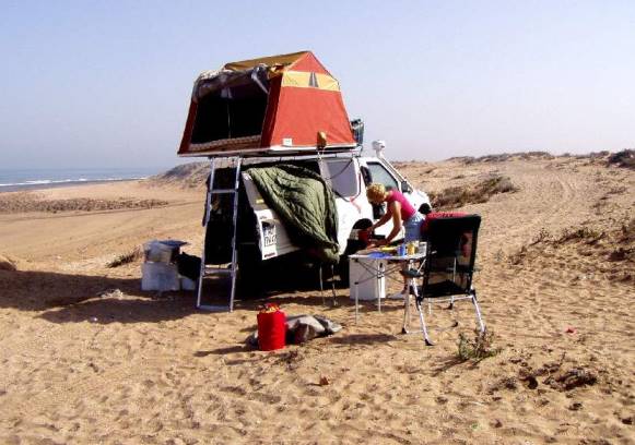 Wir wollen uns aber langsam wieder auf das Land und die Menschen einstellen und wählen deshalb den landschaftlich schöneren Weg entlang des atlantischen Ozeans. Unsere erste Übernachtung in Marokko werden wir in El Jadida (die Schöne) auf dem Campingplatz verbringen. Für diese Reise bevorzugen wir wieder das Dachzelt auf unserem Autodach: Das hat den Vorteil, weit oben überall sicher schlafen zu können. Ausgeruht geht es weiter durch Marokko und die Westsahara, die nur auf einer einzigen Straße zu durchfahren ist ...