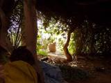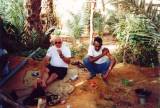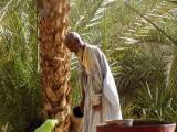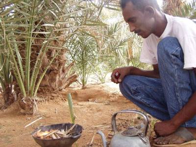 Wir folgen dem Führer, der erst noch zwei Freunde begrüßt und uns vorstellt. Er kommt auch gleich zur Sache und holt Wasser aus dem Ziehbrunnen, aus einem Versteck bringt er eine kleine Feuerschale, einen Teekessel, schwarzen Tee, Zucker und ein paar kleine Teegläser- die Minze pflückt er direkt in der Oase. Wie bei der vorher beschriebenen Teezeremonie trinke ich wieder das Konzentrat. Wir genießen zwischenzeitlich die unendliche Ruhe ohne jegliche Geräusche um uns und die etwas niedrigeren Temperaturen im Vergleich zu draußen.