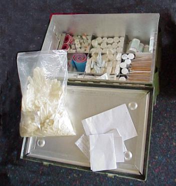 Richtig neugierig sind wir aber auf die Militärkisten: Da gibt es jede Menge Utensilien für den medizinischen Notfall - Handschuhe, Verbandsmull, Pflaster, Hightech-Schienen wie Sam Splint, Bandagen, Verbandstücher, allerlei Tinkturen und und und ... Man erfährt von Unterschieden zwischen militärischem und zivilem Verbandsmaterial und kann die Qualitätsunterschiede prüfen.