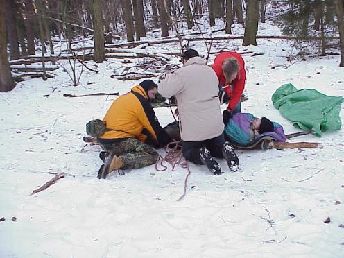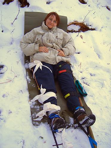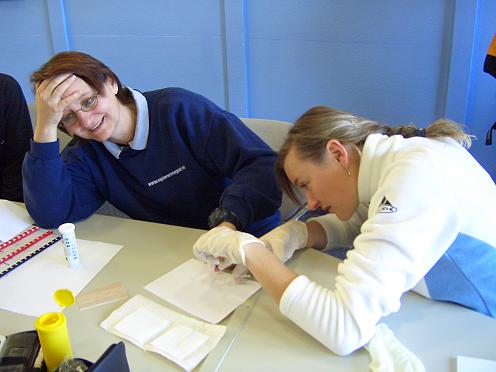 Blutdruck messen, mit dem Stethoskop abhören, mit verschieden geformten Skalpellen schneiden, Nahtstreifen aufsetzen, aus Iso-Matten Halskrausen basteln, offene Brüche versorgen, den richtigen Umgang mit Alkoholtupfern und vieles mehr können wir im Schulungsraum üben. Der Griff zum Handschuh wird für uns immer selbstverständlicher. Allmählich lernen wir Dinge, die man im "normalen" Erste-Hilfe-Kurs gelernt hat, kritischer zu sehen: Die viel gepriesene stabile Seitenlage ist z.B. nur in wenigen Situationen sinnvoll. Draußen in der Wildnis reicht es nicht, den Patienten zu versorgen, wir müssen über Transport, Übernachtung, Schutz vor Wetter usw. nachdenken.