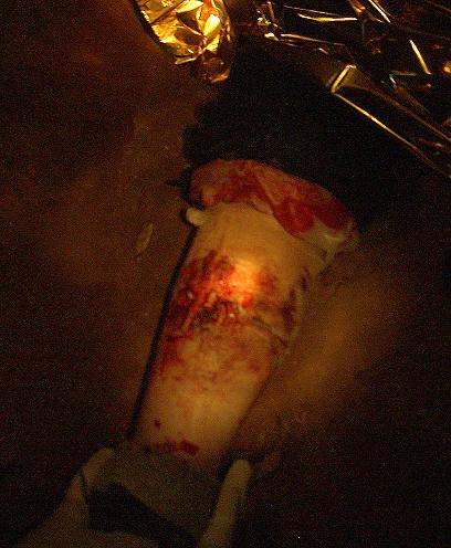 Höhepunkt ist jedoch die Nachtübung: Mit allem, was der Schminkkasten hergibt, bastelt Kurt an meinem Unterschenkel einen offenen Bruch. Blut fließt reichlich. Der Knochen steht heraus. Fast meine ich beim Anblick meines Beines Schmerzen zu fühlen. Als Unfallopfer liege ich in einer Höhle und obwohl ich sehr warm angezogen bin, spüre ich den eiskalten Felsboden. Die Vorstellung, dass man hier mehrere Stunden auf Hilfe warten müsste, ist mehr als unangenehm.
