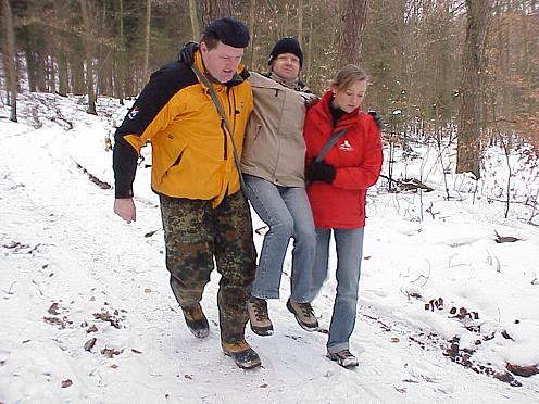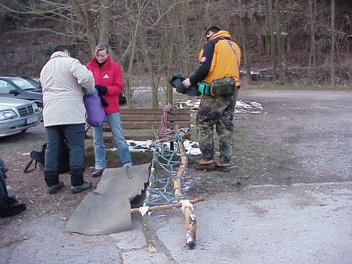 Zweck der Übung: Wie kann man ein Unfallopfer transportieren? In der Theorie sieht es einfach aus, aber hier im Wald? Auf glatten Wegen? Bei Schnee und Kälte? Kurt hat allerlei mitgebracht: So finden wir unter anderem einen Regenumhang, Rücksäcke, Schlafsack, Plane, Walking Stöcke, Iso-Matte, Seile, Gurtschlaufen. Alles kommt zum Einsatz und wird ausprobiert. Zum Schluss bauen wir aus einem Seil und gesammeltem Holz eine Trage und verpacken den ebenfalls teilnehmenden Christian warm und gesichert darauf. Nun macht sich das Üben von Knoten schon bezahlt: Wir müssen unser Opfer durch den Wald tragen und es soll ihm beim Transport nichts passieren. Obwohl Christian ein Leichtgewicht ist, merkt man schon, dass der Transport mühsam ist. Auch hier weiß Kurt Rat, mit Trageschlaufen wird alles leichter und bald kommt Christian wohlbehalten auf dem Parkplatz an.