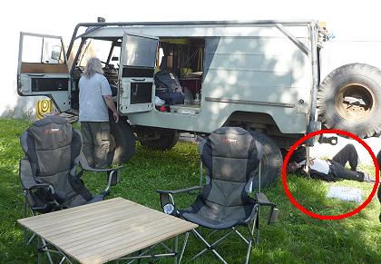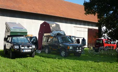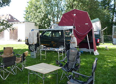 Als wir am Samstagmorgen gegen 10:00 Uhr bei Terra-Muc eintreffen, finden wir vor Ort bereits reges Campingleben vor: Die "Norddeutschen", Claus und Renate waren nach mehr als 600 km Anreise bereits am Freitag Abend eingetroffen, ebenfalls schon da seit dem Vorabend sind Karl mit seinem Volvo Lappländer, auch "Valp" genannt, und sein Verwandter Max, der ebenfalls einen hat (als Dreiachser), diesen jedoch wegen Problemen mit dem Ölkühler nicht mitbringen konnte. Rudi mit Ehefrau Brigitte sind samt Defender und Wohnwagen auch schon da ... Bald stößt noch Sepp dazu mitsamt Ehefrau Renate und seinem selbstausgebauten Bremach T-Rex und und und ... Auch Wrangler und Unimog folgen noch: Insgesamt eine nette Mischung diverser Fahrzeuge sammelt sich auf dem "Campgelände" ...