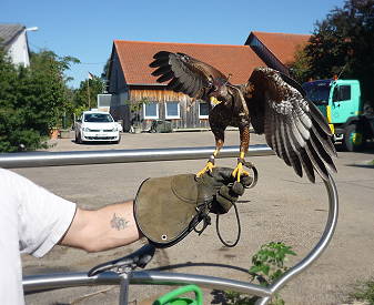 Der Nachmittag in Haimhausen wird sehr unterhaltsam: Wir lernen Christian in seiner Eigenschaft als Falkner kennen und haben später auch Gelegenheit, in seiner Werkstatt die von Claus und Renate mitgebrachten Bilder der letzten Touren nach Russland und Rumänien anzuschauen - was wir sehen, macht Lust auf mehr! Der Abend vergeht wie im Fluge bei guten Gesprächen, Gegrilltem und auch dem einen oder anderen Bierchen. Einige der "Süd-Friends" brechen später wieder auf nach Hause, während wir bei den "Campern" bleiben und erst am Sonntag zurück wollen.