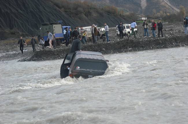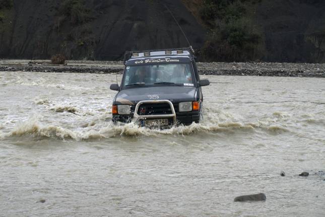 Immer wieder mussten wir zwischen den trockenen Passagen durch das Wasser, bis es schließlich einen Geländewagen erwischte: Mitten in den Fluten blieb er stecken und lief voll Wasser. In einer schnell eingeleiteten Rettungsaktion mit Bergegurten und Seilwinde wurde er geborgen, aber der Motor war natürlich defekt.