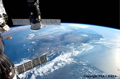 Langsam dreht sich die Erde vor meinen Augen, der Tag-Nachtschatten wandert vorbei und im dunklen Teil der Erdkugel leuchten alle Großstädte der Kontinente hell auf. Das auffälligste Gebilde dabei ist das hufeisenförmige Lichtmuster von Florida. Wieder Tag geworden fliegt unser Raumschiff über Asien und die arabische Halbinsel in Richtung Sahara, das Mittelmeer erscheint ziemlich klein und unscheinbar.