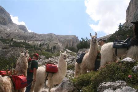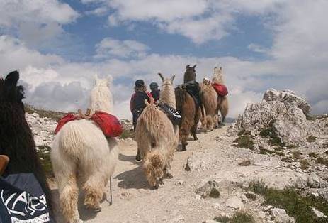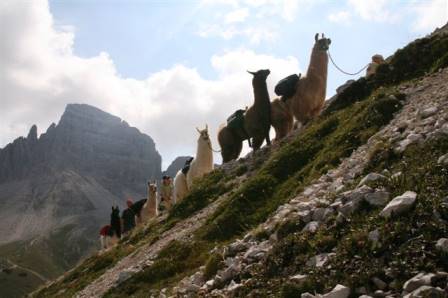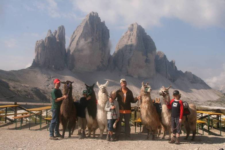 Vor längerer Zeit hatten wir die Idee, in den Dolomiten Südtirols ein Lamatrekking zu unternehmen. Diese Idee konnten wir nun in die Tat umsetzen: Zwei Erwachsene, drei Kinder und fünf Lamahengste machten sich auf den Weg, das Hochplateau der "Drei Zinnen" zu erwandern. Wir hatten uns vorher überlegt, was alles mitzunehmen war: Packsättel und -taschen, fünf Schlafsäcke, Rucksäcke mit warmer Kleidung, Ersatzwäsche und Toilettenartikel, Haken um die Lamas anzubinden, ein langes und einige kurze Seile und natürlich die Marende (Südtiroler Ausdruck für Zwischenmalzeit) und ausreichend Trinkwasser ...