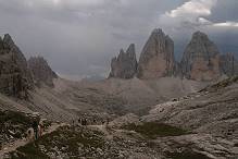 Der Rückweg führt uns abermals an der Dreizinnen-Hütte vorbei, wobei wir uns zeitweise wie auf Alp d´Huez bei der Tour de France vorkommen: Beklatscht und bestaunt von Fans steigen wir zur Dreizinnen-Hütte hoch. Mittlerweile ist es 14 Uhr geworden und wir müssen uns etwas beeilen, um bis zum Abend zu unserem nächsten Ziel, dem Fischleintal, zu gelangen. Deshalb machen wir uns nach einer kurzen Stärkung wieder an den Abstieg. Nach einer gewissen Zeit spüren wir unsere Knie und Füße mehr als deutlich: Der Abstieg geht allmählich in die Gelenke.
