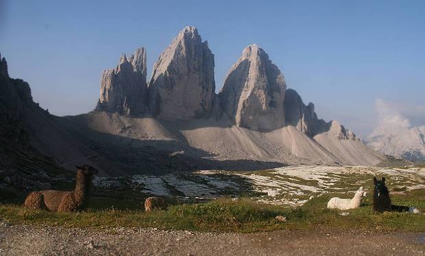 Am nächsten Morgen bietet sich uns ein wunderbarer Anblick auf die Drei Zinnen, der die Mühen beim Aufstieg vergessen macht. Die Lamas haben die Nacht unter freiem Himmel verbracht und sind offenbar wieder gut erholt. Nachdem wir ausgiebig gefrühstückt haben, wollen wir uns wieder auf den Weg machen, brauchen aber einige Zeit, bis diejenigen, die noch keine Fotos gemacht haben, auch auf ihre Kosten gekommen sind.