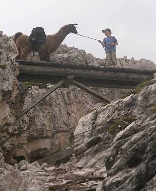 Die Dreizinnen-Hütte liegt auf 2.450 m und ist mit ihrer Gaststube und den zahlreichen Zimmern während 3 Monaten das Zentrum für Bergsteiger und Wanderer aus aller Herren Ländern in diesem Gebiet. Unser Aufstieg dauert mit Pausen etwa 6 Stunden und alle sind froh, als wir unser Ziel erreichen. Auch hier sorgen die Lamas für einige Aufregung und sind ein beliebtes Fotomotiv bei den anwesenden Wanderern, Bergsteigern und den Gastleuten. Der Hüttenwirt wünscht sich schließlich ein Foto mit den Lamas in der Gaststube, was wir ihm gerne erfüllen ...