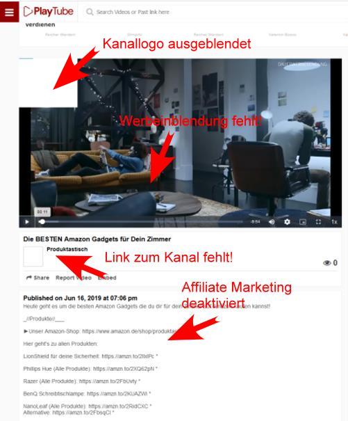 Es gibt Portale, die den gesamten Youtube-Inhalt anbieten. Dazu müssen die Portale die Videos keineswegs kopieren, sie betten die Videos ganz einfach in ihre Webseite ein. Über ihre Seite generieren sie eigene Werbeinnahmen, der original Video-Kanal bei Youtube geht leer aus, denn diese Portale unterdrücken die Werbeeinblendung von Youtube und deaktivieren jeden Link in der Beschreibung des Videos, also den Link zum Kanal, zur Webseite und natürlich zu den Produkten. Wir haben das mal kurz dargestellt: