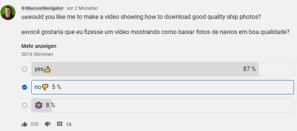 Gleichzeitig zu seiner Jammertirade lässt er die Fans abstimmen, ob er ein Video machen soll, das zeigt, wie man Schiffsbilder hochauflösend aus dem Internet runterladen kann - raubkopieren ..?