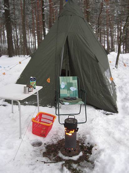 Vor Ort bestand die Gelegenheit, sich umzuschauen und zu erfahren, mit was die anderen so heizten und wie sie mit den jeweiligen Modellen zufrieden waren. Da aber fast alle Teilnehmer deutlich größere Zelte benutzten, waren die Öfen entsprechend angepasst und diese Modelle waren eindeutig für meine Zeltgröße überdimensioniert. Dazu kommt, dass diese käuflichen Ofentypen nicht gerade Sonderangebote sind. Einer der Teilnehmer des Treffens teilt mit mir das intensive Interesse für alles, was mit Hobo & Co. zu tun hat und schickte mir später eine Menge Links, die mich zu einer großen Zahl von diversen Zeltofentypen in allen möglichen Ausführungen und Gewichtsklassen führten ...