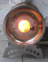 Das Grunddesign gefiel mir, aber die Ausführung war doch sehr, sagen wir mal "schlicht" gehalten. Das Ofenrohr war einfach auf der Oberseite des liegenden Zylinders in ein in die Folie gestanztes Loch gesteckt, das Loch im Frontdeckel zum Holznachlegen nur durch ein lose davor hängendes Blech verdeckt: "Verschlossen" kann man ja nicht sagen. Das alles wurde von außen mit ein paar dünnen Gewindestangen und Drahtschlingen zusammengehalten. Halt alles auf geringes Gewicht und möglichst einfache Technik getrimmt. Einträge in diversen Foren zeigen, dass der Ofen seinen Dienst tut und funktioniert. Trotzdem, mir war das alles irgendwie zu "fieselich" ...