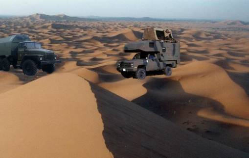 Die beiden großen UNIMOGS waren in sandtarn gehalten. Sie hatten nur ein Planenverdeck und keinen festen Koffer hintendrauf - halt so, dass der Sandwind noch durchpfeifen kann.