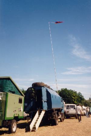 Zuerst wird der ca. 12 m hohe Antennenmast ausgefahren und wir befestigen an der Spitze einen Windsack - soll doch niemand sagen, wir hätten unser ganzes Drachen-Equipment völlig umsonst nach Zellerreit gekarrt!