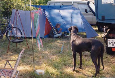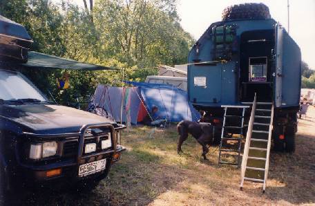 Dann wird das Cockpit des IFA erklommen, der Überblick ist ebenso beeindruckend wie der Copilotenplatz für Leo: Auf der Mittelkonsole weich gepolstert ein Lagerplatz für die riesige schwarze deutsche Dogge, einem offensichtlich begeisterten Expeditionshund, der uns nach und nach mit seinem "umwerfenden Charme" ins Herz schließt (man beachte nur die Einstiegsrampe für Leo an der Rückseite des IFA) ...