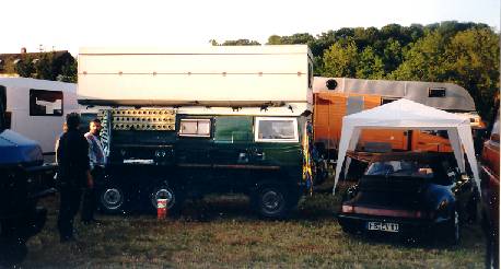 Aber wie dem nun mal sei, Klaus Därr verkauft in diesen Tagen nun anscheinend mal lieber beratungsarme Benzinkanister und teilweise durchgerostete Sandbleche, wie man sehen kann. Jedoch hat der Stand am ersten Tag dieses noch nicht anzubieten, nur einige Plastikkisten, Kataloge und vereinzelte Reiseführer tummeln sich auf dem Verkaufsregal. Aber eigentlich sind sich alle einig, man kommt ja schließlich nicht wegen "dem Därr" zum Treffen.