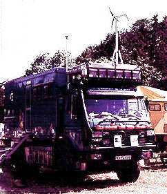Einige Meter weiter entfernt wird uns vorgeführt, daß der Wind nicht nur zum Spaß dient. Ein Windgenerator auf einem Expeditions-LKW zeigt, daß alternative Energiegewinnung nicht nur der Sonne vorbehalten ist.