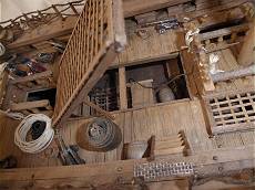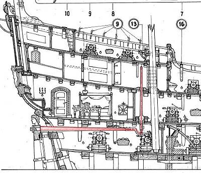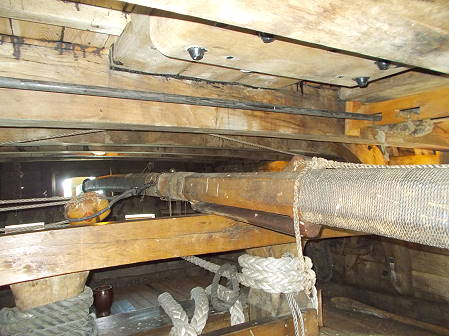 Kommt man ganz hinten im Heck des Schiffes an und begibt sich ein Deck tiefer, findet man die Ruderanlage. Hier ist die hölzerne Pinne zu sehen (siehe Bild), die mehrere Meter lang ist. Da sich an dieser Stelle im Normalfall keine Menschen aufhalten, ist alles sehr eng. Es ist gerade so viel Platz, wie Arbeiter zur Instandhaltung benötigen.