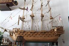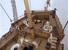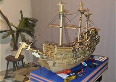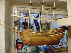 Doch zuvor sollten doch noch eine paar kleine An- und Umbauten vorgenommen werden, bevor wir sie in der Werft "vorstellen" konnten. Auf die Frage, welchen Maßstab er denn beim Schiffsbau verwendet hätte, kamen als Antwort freundlicherweise jede Menge Schiffsbaupläne zu uns: So verfügen wir nun z.B. über die Pläne der SANTA MARIA (1:100), MAYFLOWER (1:65) und SAN JUAN (1:100), auf den Plänen anderer ähnlich dimensionierter beeindruckender Segler wie der H.M.S. ENDEAVOUR, SAN FRANCISCO S. XVI oder LE HUSSARD 1848 waren dagegen keine Maßstäbe zu finden oder wurden vielleicht bei schneller Durchsicht übersehen. Sven selbst nannte keinen Maßstab unseres stolzen Neuerwerbs, womit klar zu sein schien, dass wohl kein einheitlicher Maßstab vorlag. Dafür sprachen auch einige Eindrücke vom Modell, wie z.B. manche ziemlich kleine Kanonen an Bord z.B. im Vergleich zu den Treppen an Deck o.ä.