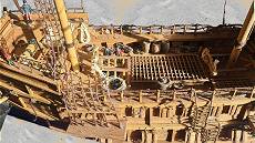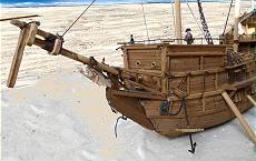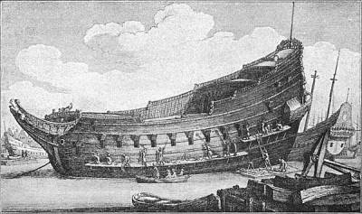 Doch wie verlief nun die weitere Fahrt unseres Seglers? Da die BATAVO zur dringenden Überholung leider nicht mehr in eine Werft gebracht werden konnte, konnte sie nun nach seitlicher Abstützung an einem nahen Uferabschnitt nur notdürftig repariert werden (siehe Bilder unten). Das Schiff hat keine Takelage mehr, da die defekten Masten wieder neu aufgebaut werden müssen. Der hintere Heckmast wird gerade mittels wieder Flaschenzug aufgerichtet. Ein Besatzungsmitglied überprüft am Heck den Fortschritt der provisorischen Arbeiten.