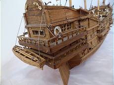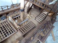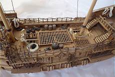 Umrechnen war also angesagt: Die 3 bis 3,4 cm hohen Figuren ergaben in Hinblick auf vermutliche Größen etwa im 17. Jahrhundert ungefähr einen Maßstab von ca. 1:53 und die Länge unseres Schiffes in der "Realität" rund 50 m - also ziemlich genau die Größe der einstigen BATAVIA! Somit war nun klar: Das "Original" unseres Modells sollte jetzt also ein rund 50 m langer Dreimaster aus dem 17. Jahrhundert sein mit allen Eigenschaften, die daraus folgerten. Die BATAVO würde fortan als ständige Erinnerung an den von Jürgen Sattler besuchten Nachbau in Lelystad dienen. Das Deck wurde inzwischen ebenfalls auf diesen Maßstab "umgebaut", zu kleine Kanonen verschwanden so oben, nur die größeren im Unterdeck blieben an Bord: Und ihre Klappen geöffnet lediglich auf der rechten Seite (Steuerbord).