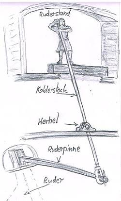 Ein solcher Kolderstock, auch "Ruderschwengel" genannt, war ein nach unten laufender Stab, der mit der Pinne verbunden war und somit auf diese Weise von mehreren Mitgliedern der Mannschaft gleichzeitig bedient werden konnte, wie unsere Abbildungen zeigen. Auch in Jürgens Bericht vom Besuch der BATAVIA wird kurz die "Pinne" erwähnt, die zu diesem Kolderstock-Mechanismus gehört (siehe unten).