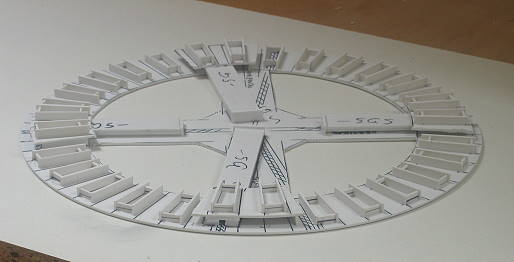Der größere der beiden Ringspanten von Segment -5 (minus fünf), noch nicht fertig. Dieser Ringspant stellt insofern eine Besonderheit dar, als er Führungen zum späteren Einstecken der Leitwerks-Stangen enthält. Der Luftschiff-Fachmann erkennt das typische "Herabhängen" der Höhenleitwerke um jeweils 10 Grad aus der Horizontalen.