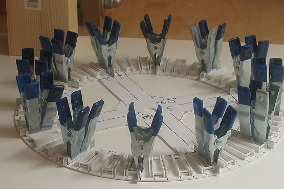 Der größere der beiden Ringspanten von Segment +6 (plus sechs). Klammern fixieren einen Teil der Längsspant-Führungsschienen, solange der Klebstoff noch nicht fest ist. Aluminium-Plättchen halten die jeweiligen Paare der Längsspant-Führungsschienen auf exakt 1 mm Abstand. Der Klebstoff verklebt praktisch nicht mit Metall.