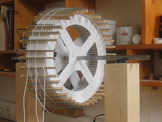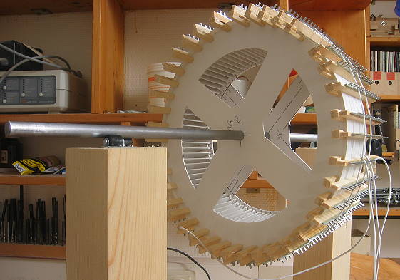 Rechts vorne Ringspant-Schleif-Einrichtung. Links hinten die bis jetzt angefangenen Segmente, noch nicht fertig.