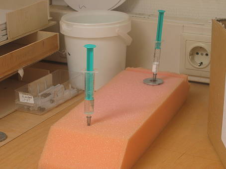 Die Spritzen-Ecke. Der Klebstoff lässt sich sehr gut und fantastisch sparsam mit Spritzen verarbeiten. Die hintere Spritze enthält Weißleim, auch das geht sehr gut. Weißleim brauche ich aber nur für Hilfseinrichtungen aus Holz. Das Modell ist komplett aus Kunststoff, genauer Polystyrol. Der Klebstoff heißt exakt Ruderer L402. Achtung: Nicht L530 andrehen lassen, der klebt an Metall zu gut fest und ist vermutlich wesentlich teurer. Eine Spritze lässt sich etwa 5 mal wieder befüllen, bevor sie unbrauchbar wird. Die vordere Spritze hat diesen Zustand bereits erreicht, erkennbar an dem Klebstoff auf der "falschen" Seite. Die Kanüle muss man öfter auswechseln, nämlich immer dann, wenn sie eingetrocknet ist, das dauert so etwa 4 Stunden, trotz Hineinstecken in Schaumstoff.