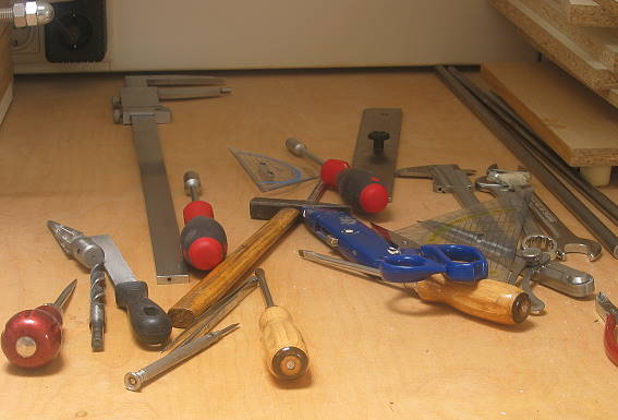 Ein Teil des benötigten Werkzeugs. Am ungewöhnlichsten (und teuersten) ist die bis zu 50cm beherrschende Schieblehre. Dieses Exemplar, made in China, habe ich von user "zerspanwerkzeuge" über Ebay für 50 Euro plus Versandkosten gekauft, erfüllt seinen Dienst perfekt. Im Laden kostet so ein Ding 200 Euro.