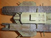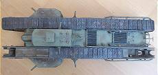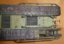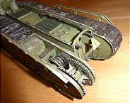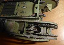 Zurück zum MARK VIII: Auch dieses Modell haben wir standardmäßig "eingeschmutzt" und noch mehr: Da man hier ebenfalls Teile bauen kann, die nach Fertigstellung des Modells niemand mehr zu Gesicht bekommt, weil sie verdeckt im Inneren liegen, haben wir wie auch schon bei den Innendarstellungen des Renault FT von GPM wieder mit abnehmbaren Teilen gearbeitet: Den vorderen und hinteren Teil des linken Kettenmoduls gibt es deshalb mit der möglichen Innenausstattung. Wenn man die Oberteile der Kette abnimmt, erhält man Einblick in das Innere der Kettenführung und hinten in die Übertragungszahnräder des Kettenantriebs. Der vordere Teil der Kette ist zusätzlich wie bei einer Montage heruntergeklappt und ermöglicht so auch einen Einblick von vorn unten.