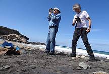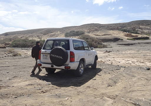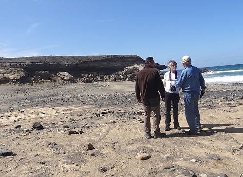 Schnell wird klar, dass dies kein Tourist ist, der aus dem Wagen steigt und auf uns zukommt. An seinem Fahrzeug steht groß zu lesen: "Ministerio de Medio Ambiente, Demarcación de Costas de Canarias" - ein Mitarbeiter der "guten alten" Umweltbehörde, die sich auch mit der Küstenvermessung beschäftigt und auf die wir hier bei deren grandiosen Umweltschutzbemühungen seit ganz frühen Zeiten immer und immer wieder treffen. Ganz zu Anfang waren es unsere Drachen, die störten, und nach etlichen späteren Begegnungen sind es diesmal wieder wir selbst: Der Mann, der natürlich nur Spanisch spricht, erklärt uns, dass wir nur oben mit dem Auto stehen dürften (er weist auf die Abbruchkante mit einem der berühmten weißen Vermessungs-Stumpfkegel hin, mit denen wir uns bereits früher ausgiebig beschäftigt haben). Hier unten in der Bucht dürften wir jedenfalls nicht mit dem Fahrzeug stehen. Wenn die Guardia Civil käme, müssten wir eine Strafe zahlen ...