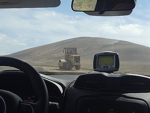 Es vergehen 6 Tage, bis wir schließlich auf Fuerteventura an der Playa de Garcey stehen: Das Explorer Team fährt am heutigen Donnerstag, den 25.02.16, erstmals auf einer derart guten Piste zur einsamen Bucht, wie wir sie in all den vergangenen Jahren noch niemals angetroffen haben. Gleich an zwei Baumaschinen müssen wir dabei vorbei, die heute hier tätig sind. Nach einer Walze folgt viel später erst kurz vor der Bucht noch eine weitere riesige Maschine, an der wir nur mit Mühe vorbei kommen, da dieses Gerät nicht einmal über Rückspiegel verfügt: Äußerst ungewöhnlich!