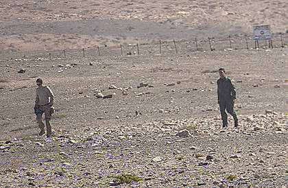 Wir verabschieden den mysteriösen Mann, nur um kurz darauf von oben aus eine weitere merkwürdige Entdeckung zu machen: Wir beobachten mit unserem Teleobjektiv im entfernten Militärgelände zwei Personen, die wiederum uns aus der Ferne beobachten und kurz darauf in unsere Richtung marschieren. Was hat das nun wieder zu bedeuten? Man hatte vor kurzem lesen können, dass das Militär inzwischen auch das ganze Gebiet bis zur Playa de Garcey beansprucht und die zuständige Inselbehörde angeblich dagegen sei - danach hatten wir nichts mehr davon gehört oder gelesen.