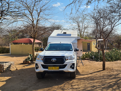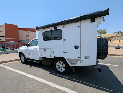 Wir hatten irgendwie ein weitläufiges Gelände erwartet, denn ASCO Car Hire ist der größte Autovermieter in Namibia mit großem Fuhrpark. Nach einer Warteschleife bei verspätet eintreffenden weiteren Mitfahrern treffen wir erstaunt in einer Art Hinterhof ein, vollgepackt mit allen möglichen Geländewagen mit Dachzelten oder Kabinen. Wer hier arbeitet, muss wohl zentimetergenau rangieren können. Wir müssen etwas warten und beobachten dabei das bunte Treiben auf dem Hof. Es treffen ständig Fahrzeuge ein, die offensichtlich die Tour beendet haben und auch Kleinbusse mit Touristen, die ebenfalls auf ihren Mietwagen umsteigen wollen.