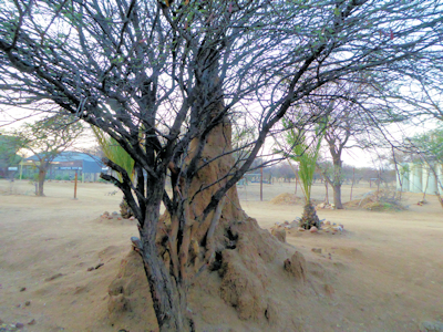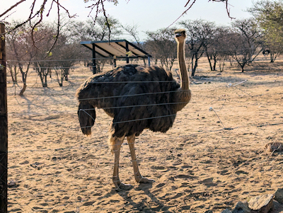 Unweit vom Stellplatz steht ein beeindruckender Termitenhügel, der von einer kleinen Kap-Hamsterratte bewohnt wird. Wenige Schritte entfernt beginnt das riesige Straußengehege der Farm.