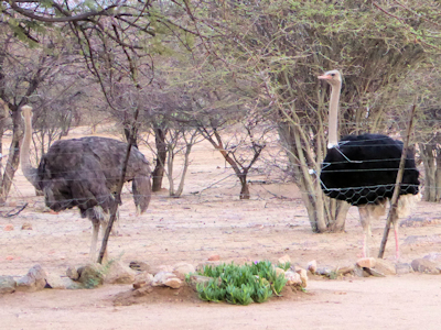 Nach ca. 90 km erreichen wir das Ombo Rest Camp, eine Straußen- und Krokodilfarm. Wir werden schon erwartet und können uns auf dem Gelände einen schönen Stellplatz mit Wasser- und Stromanschluss aussuchen. Zwischen Kaktusfeigen und laublosen Bäumen findet sich ein Plätzchen mit angeschlossenem Pavillon, unter dem wir uns im Schatten das wohl verdiente, eiskalte Bier gönnen: Die Engel-Kompressorkühlbox hat gute Dienste verrichtet.