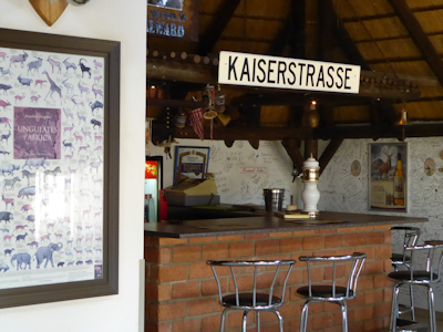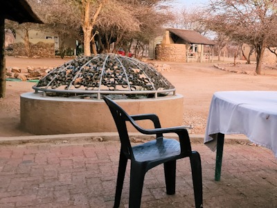 Zum Camp gehört ein Restaurant, in dem Dinner und Frühstück vorgebucht wurden, wir wollten am ersten Tag alles ganz easy angehen lassen. Der Außenbereich des Restaurants ist hübsch gestaltet mit Blick auf das Straußengehege. Zu essen gibt es Wild - welches Tier, war nicht zu erfahren, und als Alternative Huhn.