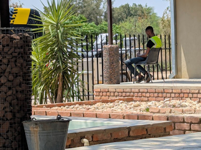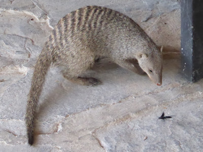 So können wir unser Camp aufbauen und anschließend einen Rundgang auf dem Gelände machen. Dabei kann man die kleinen Mangusten beobachten, die alles aufgraben, insbesondere dort, wo gepflastert wurde. Versucht man neben ihnen ebenfalls ein wenig zu graben, kommt der Mangustenchef angerast und zwickt einen zart in die Hand - wohl keine Liebesbezeugung, vielleicht eher eine Maßregelung. Bunte Vögel fliegen herum, wir begeben uns zum campeigenen Wasserloch, das gerade von einer Herde Springböcken besucht wird.