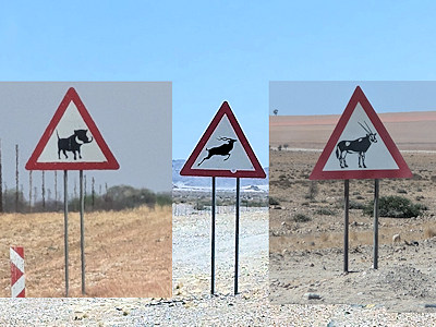 Irgendwann muss es weitergehen, die heutige Strecke ist eine der längsten der ganzen Reise: Die Landschaft wird nun etwas hügeliger und am Horizont sind bereits Berge zu erkennen. Nach und nach lernt man die unterschiedlichen Schilder für die Warnung vor Wildwechsel kennen: Wildschwein, Oryx-Antilope und Springbock sind hier zu Hause ...