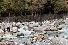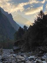 Ahornbäume verlieren ihre gelben Blätter. Auf schwarzrindigen Riesen wachsen rote Farne. Andere immergrüne Gewächse mischen sich dazwischen, vereinzelt Tannen und Lärchen. Wir gehen über neue, provisorische Holzbrücken, Waldbodenanstiege, Felsstufen. Im Tal rauscht der Fluss durch die hellgrauen Felsen, oft in bizarren Formen abgeschliffen. Im Süden, also zu unserer Rechten, steigt der Wald steil an. Gegenüber wechseln sich steile schwarze Felsanstiege mit Mischwaldhängen ab. Ein Waldstück aus niedrigerem Rhododendron, hohen Blaufichten und schlankem Bambus folgt. Ein Adlerpaar segelt über uns hinweg, von der nördlichen Fünftausender-Kette zur gegenüberliegenden.