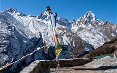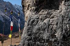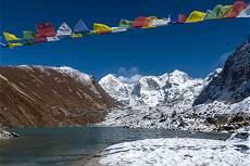 Von Naa aus wandern wir auch zum Dudh Kunda. Links und rechts des Hügelbands, über das wir gehen, liegen Gletscher, gesäumt von langgezogenen Moränen. Vor uns, im Norden, bildet eine Bergkette die Grenze zu Tibet. Dort taucht der Gauri Sankar mit seinen zwei Siebentausender-Gipfeln auf. Türkisblau liegt der Dudh Kunda in der Schneelandschaft. Für buddhistische wie hinduistische Besucher ist der See von großer Bedeutung, ein heiliges Bad darin soll Sünden wegspülen und Wünsche erfüllen. Auf quadratischem Unterbau erhebt sich ein weiß getünchter, schlichter, würfelförmiger Chörten. Er symbolisiert Buddha und seine Lehre. Eine goldene Spitze, welche für das Nirvana steht, ziert das aus Steinplatten gefertigte Dach. Bunte Gebetsfähnchen, in alle Himmelsrichtungen gespannt, wehen im Wind. Stille umgibt uns, absolute Stille ...