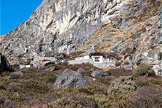 Unweit davon, unter einem Felsen, welcher der Form der Mütze eines buddhistischen Lehrmeisters ähnelt, befindet sich eine Höhle. Der Überlieferung nach hat Guru Rinpoche hier meditiert; er lebte im achten Jahrhundert n.Chr. und gilt als Begründer des Buddhismus in Tibet. Ein Meditationsraum ist in der Höhle eingerichtet: Im Schein von Butterlämpchen empfängt uns dort der Lama Pem Chiring. Seit fünfzig Jahren lebt er hier oben. Die Bevölkerung von Naa versorgt ihn. Um Pujas zur Geburt eines Kindes zu halten oder Beerdigungsrituale, geht er ins Tal. Während des Monsuns meditiert auch ein weiser, buddhistischer Lehrmeister aus Singapur an diesem Ort.