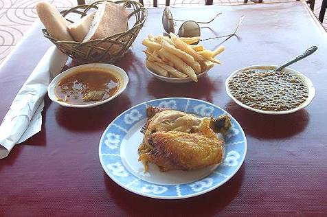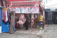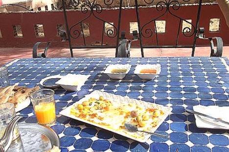 Hier in Rissani gibt es den ganz besonderen Döner: Brotteig gefüllt mit einer Ziegenfleischmasse und Zwiebeln sowie Gewürzen eingebacken - macht immens satt. Ziege und Kamel, seltener mal Schaf sind die üblichen Fleischspeisen, Rind ist sehr selten im Angebot, da zu teuer. Oft sieht man die üblichen Tajines mit einem Fleisch-/Knochenbrocken in der Mitte, überdeckt von gegartem Gemüse und Kartoffeln. Des Morgens liebt man in Marokko neben dem kargen Oliven - Honig - Brotmahl auch Eierspeisen, Omeletts bzw. Rührei in allen möglichen interessanten Varianten mit Tomatensauce und/oder Zwiebeln, Petersilie …